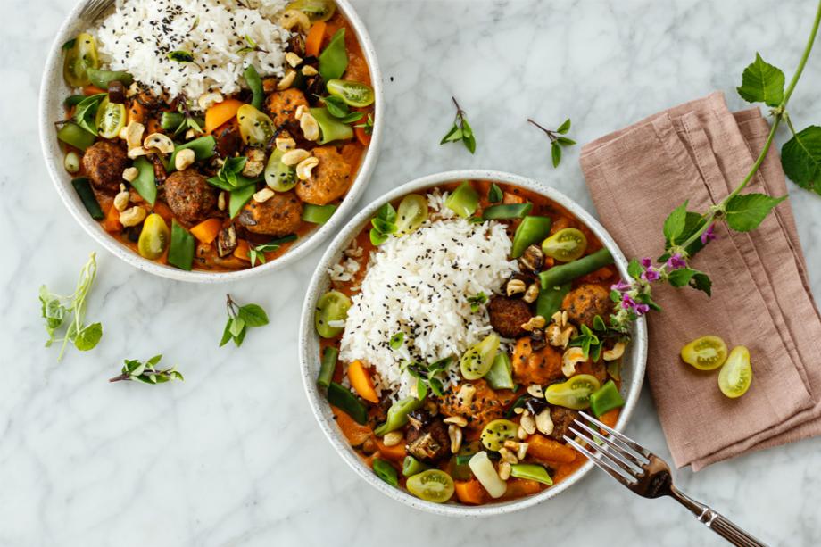Unser frisches Auberginen-Curry mit Fleischbällchen-Einlage, feiner Erdnuss-Note und süßem Kokos-Basmati-Reis steckt nicht nur voller Nährstoffe, sondern auch voller Geschmack.