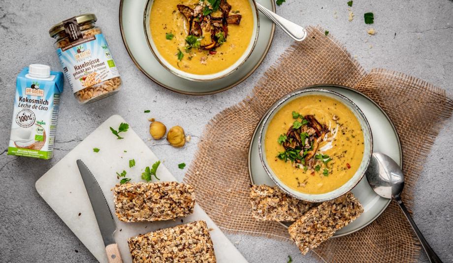 - Für das Pilz-Topping die getrockneten Steinpilze in etwas warmem Wasser für ca. 10 Minuten ziehen lassen. Anschließend die Pilze abseihen, Kokosöl in einer Pfanne erhitzen und die Pilze darin anbraten. Die kross gebratenen Pilze auf ein Küchenpapier legen und anschließend die Suppe mit den Pilzen toppen. Die Suppe zusammen mit dem Haselnussbrot servieren. Guten Appetit!